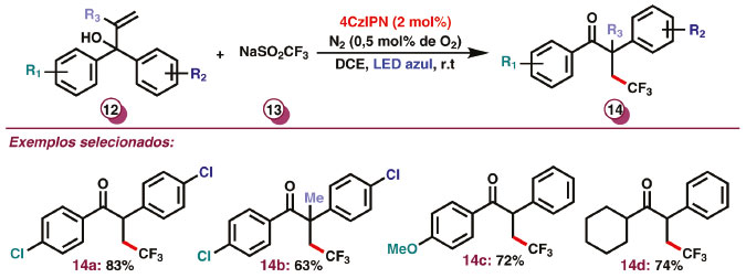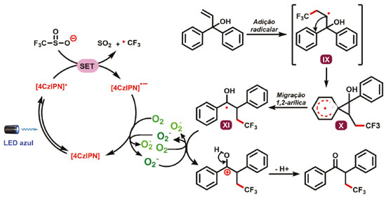 A etapa de otimização das condições reacionais mostra claramente a superioridade do 4CzIPN em relação a fotocatalisadores baseados em complexos metálicos no sistema reacional proposto. O rendimento isolado do produto da reação modelo quando se empregou 4CzIPN (86%) foi muito superior ao obtido para os complexos Ir(ppy)2(dtbpy)PF6 (45%) e [Ru(bpy)3Cl2] (traços), além de ter mostrado desempenho significantemente melhor que o complexo [Ir[dF(CF3)ppy]2(dtbbpy)]PF6 (68%). No sistema proposto, o catalisador no estado excitado abstrai um elétron do ânion sufinato levando à formação de SO2 e CF3, que reage com o álcool alílico formando um novo intermediário radicalar. A reação prossegue pela migração do grupo arílico gerando o intermediário radical IX que, após migração 1,2-arílica via radical spiro[2,5]octadienil X, dá origem à espécie radicalar XI. Por fim, o radical XI é oxidado e, após desprotonação, forma o produto β-trifluormetil-α-aril cetona 14, como mostrado na Figura 10.