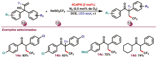 Com essa metodologia, a maior variedade de ciclopropanos policíclicos (24 exemplos) foi obtida a partir de tosilatos derivados da tetralona com rendimentos de 34 a 79%. Derivados da indanona também foram utilizados e 10 novos ciclopropanos com rendimentos que variaram de 52 a 82% foram obtidos (Esquema 5). Sistemas bicíclicos maiores também podem ser utilizados, tendo como precursor, por exemplo, derivados da benzocicloheptanona. Os rendimentos obtidos, no entanto, foram aquém do esperado, na faixa de 41 a 72%, com caso no qual não houve formação do produto. Reações que envolvem mecanismos em cascata empregando radicais também estão entre as mais empregadas para a síntese de moléculas complexas que apresentam grande aplicabilidade para indústrias em geral. Tendo isso em vista, a geração de radicais por meio de fotocatálise se apresenta como uma ótima forma de gerar radicais capazes de iniciar processos em cascata empregando condições brandas e sustentáveis. Nesse contexto, Cai e colaboradores desenvolveram a trifluormetilação de álcoois alílicos empregando o 4CzIPN sob irradiação de diodo emissor de luz azul e utilizando CF3SO2Na como precursor de radicais (Esquema 6).30