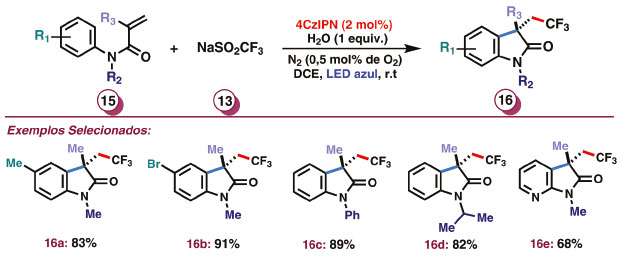 ![]() Esquema 7. Síntese de oxindóis a partir da trifluormetilação de N-acrilamidas catalisada pelo 4CzIPN