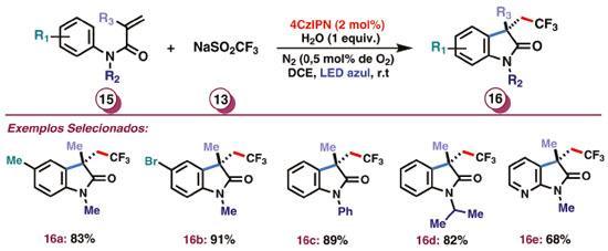 Nessa abordagem, dispensa-se a utilização de reagentes caros para a obtenção do CF3 radicalar, assim como o emprego de fortes oxidantes, como o persulfato de amônio,31 o que é comum em métodos convencionais para trifluormetilação de alcenos. Como resultado desse trabalho, foi realizada com sucesso a carbotrifluormetilação de 31 álcoois alílicos, sendo 10 simétricos (46-88%) e 21 assimétricos (66-90%). As condições reacionais se mostraram tolerantes para álcoois alílicos contendo tanto grupos substituintes retiradores quanto doadores de elétron presentes nos anéis aromáticos, independentemente de a posição ser orto, meta ou para. Ainda no mesmo contexto e empregando o reagente de Langlois 13 como fonte de radicais CF3, o grupo de Cai aplicou uma metodologia semelhante para a síntese de oxindóis a partir da trifluormetilação de N-acrilamidas (Esquema 7).32 A importância na síntese de oxindóis reside no papel significativo das amidas na indústria farmacêutica, já que cerca de 70% dos fármacos cujos compostos ativos são pequenas moléculas orgânicas mais vendidos em 2018 possui uma ligação amida.33