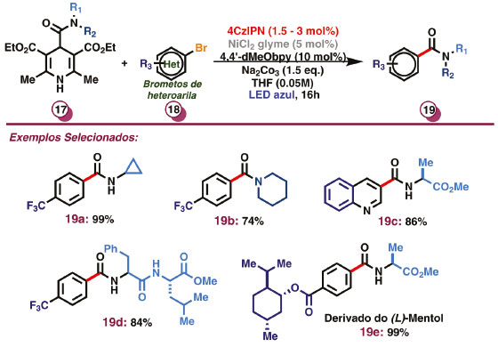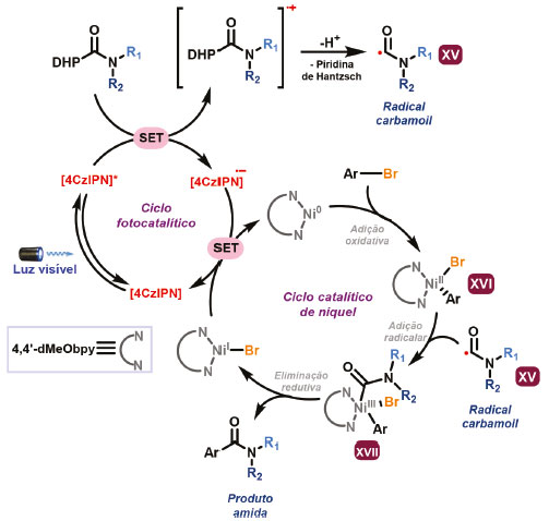 Durante a etapa de otimização, os autores testaram os complexos Ir[dF(CF3)ppy]2(dtbpy)PF6 e Ir[dF(CF3)ppy]2(bpy)PF6 como fotocatalisadores e obtiveram rendimentos de 51% e 40%, respectivamente. Por outro lado, a condição ótima, a qual emprega o 4CzIPN como fotocatalisador, levou à formação de produto com 99% de rendimento. O mecanismo reacional se inicia com a formação do radical XV a partir da transferência de um elétron entre a dehidropiridina (DHP) e o organofotocatalisador 4CzIPN (Figura 12). Simultaneamente, o complexo de Ni(II) XVI, formado a partir da adição oxidativa entre o complexo de Ni(0) e o brometo de arila 18, captura o radical XV e forma o intermediário XVII. Após a eliminação redutiva, a ligação C-C do produto de acoplamento cruzado é formada, produzindo a amida 19.