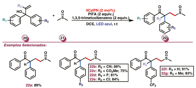 Os estudos de otimização mostraram que, nesse caso, o emprego de 4CzIPN implica em formação de produto com maior rendimento quando comparado ao uso de complexos metálicos em condições similares. O rendimento isolado do produto da reação que utiliza esse fotocatalisador orgânico foi de 89% contra 23% e 47% para os complexos [Ru(bpy)3Cl2] e Ir[dF(CF3)ppy]2(dtbpy)PF6, respectivamente. O processo se inicia pela reação entre PhI(OCOCF3)2 e 1,3,5-trimetoxibenzeno, levando à formação do intermediário XVIII que, posteriormente, reage com o fotocatalisador no estado excitado para a formação da espécie radicalar XIV (Figura 13). A reação prossegue pela abstração de um átomo de hidrogênio do DMSO e a consequente formação do radical α-sulfinil XX. Esse radical se adiciona ao álcool alílico, formando o intermediário radicalar XXI que, após sofrer migração do grupo arílico, passa pelo intermediário XXII, originando a espécie XXIII. Essa espécie é oxidada e, após desprotonação, transforma-se no produto α-aril-γ-metilsulfinil cetona 22.