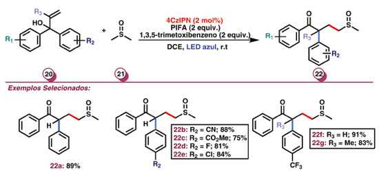 Esse método proposto permite não só a preparação direta de amidas secundárias e terciárias, mas também a modificação de peptídeos, dada a prevalência de heterociclos contendo nitrogênio em moléculas biologicamente ativas no intuito de melhorar sua biodisponibilidade e estabilidade. Nesse estudo, foram obtidos 19 arenos com rendimentos de 36 a 99% e 10 heteroarenos com rendimentos de 35 a 86%. Ainda, o grupo de Cai estudou a geração de radicais α-sulfinílicos a partir do dimetilsulfóxido (DMSO) e sua adição a álcoois alílicos, levando à formação de α-aril-γ-metilsulfinil cetonas (Esquema 9).35