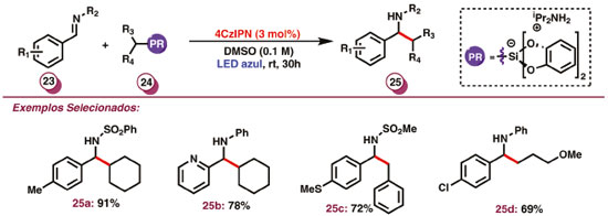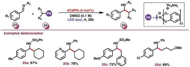 De acordo com a Figura 14, o aumento na concentração do composto de iodo hipervalente (III) XVIII resultou em uma diminuição significativa da intensidade de fluorescência do 4CzIPN, o que sugeriu fortemente a participação do composto XVIII na TUE com o fotocatalisador. A alquilação de diversos álcoois alílicos contendo anéis aromáticos substituídos nas posições meta e para se processou de forma eficaz tanto para substituintes doadores quanto retiradores de elétrons. Ao todo foram obtidos 34 α-aril-γ-metilsulfinil cetonas com rendimentos de bons a excelentes (49-92%). Nas reações citadas anteriormente, os radicais gerados pelo 4CzIPN foram interceptadas por ligações C=C. De forma análoga, moléculas contendo ligações C=N também podem agir como aceptores de radicais, podendo, assim, serem empregadas em transformações fotoquímicas. Em contrapartida, também é possível a geração de radicais α-amina a partir de processos de transferência de um elétron envolvendo ligações C=N, possibilitando reações de acoplamento radical-radical. Um exemplo desse tipo de reação foi reportado por Molander e colaboradores, no qual foram geradas ligações C-C a partir da reação entre biscatecolatos alquílicos e iminas catalisada pelo 4CzIPN em DMSO (Esquema 10).36