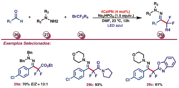 ![]() Esquema 11. Acoplamento multicomponente entre aldeídos, hidrazonas e espécies bromodifluoradas catalizado por 4CzIPN