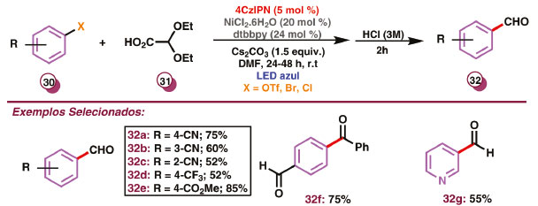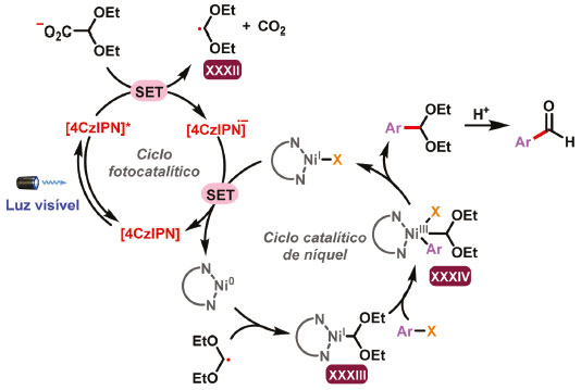 No mecanismo proposto pelos autores, a abstração de um elétron do ácido glioxílico pelo fotocatalisador no seu estado excitado leva à formação do radical XXXII acompanhada da liberação de CO2. O radical XXXII então se adiciona ao complexo de Ni(0) para a formação do complexo diacetal-Ni(I) XXXIII que, após a inserção oxidativa do composto 31, leva à formação do complexo de Ni(III) XXXIV. A reação prossegue pela eliminação redutiva do diacetal arílico, que é convertido ao aldeído arílico correspondente após tratamento com solução aquosa ácida (Figura 18).