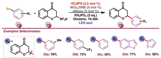 O 4CzIPN mostrou-se fator determinante para a ocorrência dessa reação, visto que a troca desse organofotocalisador por Mes-Acr e por Eosina Y não levou à formação do aldeído. Foram realizados diversos exemplos com diferentes grupos funcionais, tendo sido obtidos rendimentos de 45 a 90%. Molander e colaboradores ainda investigaram a síntese de flavanonas através de uma catálise dupla fotoredox com níquel (Esquema 13).40 Flavanonas são metabólitos secundários dos flavanoides e são abundantes na natureza, estando presentes, por exemplo, em frutas cítricas.41 Seus usos mais comuns são em suplementos para dieta e como potentes agentes terapêuticos, no combate à ansiedade42 e como inibidor da transcriptase reversa da HIV-1.43 De maneira geral, as flavanonas são obtidas a partir de chalconas. Neste trabalho, no entanto, Molander propôs a obtenção dessa classe de compostos através de um acoplamento cruzado entre haletos de arila e heteroarila e derivados do 2-trifluorboratocromanona.