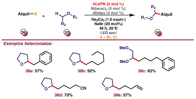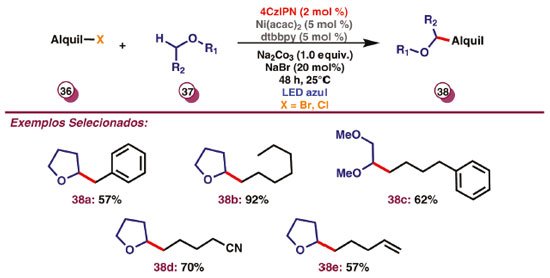 De acordo com o mecanismo proposto (Figura 19), a adição oxidativa do haleto de alquila ao complexo de Ni(0) gera o complexo XXXV que, por sua vez, é oxidado pelo fotocatalisador no estado excitado, fornecendo o correspondente complexo XXXVI. Esse complexo XXXVI pode absorver luz visível e sofrer fotoeliminação, gerando o radical XXXVII eletrofílico. Em seguida, a espécie radicalar XXXVII atua como um agente de transferência de átomo de hidrogênio, abstraindo o átomo de hidrogênio do carbono α ao oxigênio, gerando, portanto, um radical centrado no carbono que se adiciona ao complexo de Ni(II) (XXXVII). Por fim, ocorre uma eliminação redutiva formando o produto de acoplamento cruzado e o complexo de Ni(I) que, posteriormente, é reduzido para Ni(0) pelo 4CzIPN-, regenerando ambas as espécies catalíticas ativas e fechando os dois ciclos catalíticos.