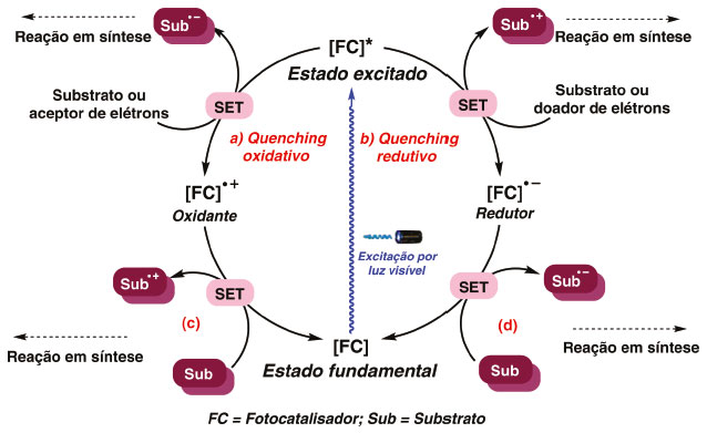 Fotocatálise Um bom fotocatalisador deve ser capaz de ser fotoexcitado para que seja possível a sua participação em processos fotoredox com outras espécies. O tempo de meia-vida desse estado na ausência de um substrato deve ser grande o suficiente para permitir que, durante a fotocatálise, o catalisador e o substrato reajam eficientemente, ou seja, quanto maior a vida útil do fotocatalisador, maior será a probabilidade de reação.6 O rendimento e a vida útil do estado singleto excitado podem ser obtidos a partir de medições de fluorescência, enquanto os dados correspondentes para o estado tripleto podem ser obtidos a partir de medições de absorção transitória. O fotocatalisador, ao absorver luz em um comprimento de onda específico, gera um estado eletronicamente excitado e pode, então, seguir dois caminhos distintos para realizar a troca de elétrons: o quenching oxidativo, representado na Figura 2a, no qual ocorre a transferência de um elétron (TUE) do fotocatalisador excitado, denominado [FC]*, a uma molécula de substrato, gerando o fotocatalisador oxidado [FC]+; ou o quenching redutivo, representado na Figura 2b, no qual o fotocatalisador excitado abstrai um elétron do substrato, oxidando-o a partir de uma TUE, enquanto o fotocalisador se reduz, formando a espécie [FC]-. Posteriormente, [FC]+ e [FC]- podem ser regenerados por meio de uma reação de redução (Figura 2c) ou oxidação (Figura 2d), respectivamente, reagindo com uma molécula de sacrifício presente no meio reacional. Os produtos finais são o fotocatalisador e uma espécie iônica que reagirá com o substrato em seu estado fundamental.6