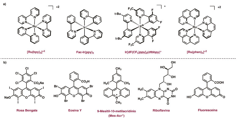 ![]() Figura 3. Estruturas dos catalisadores fotoredox. a) Complexos metálicos polipiridínicos de Rutênio e Irídio; b) Catalisadores orgânicos