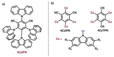 ![]() Figura 4. a) Estrutura 4CzIPN; b) Posições funcionalizáveis da porção carbazólica do 4CzIPN