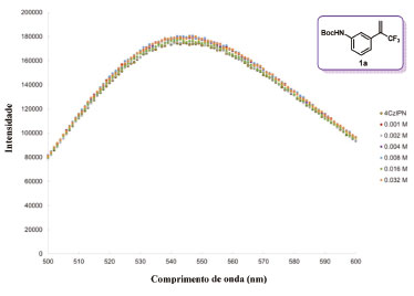 Também foram realizados alguns experimentos a fim de se obter maiores informações sobre o mecanismo da reação. Os primeiros experimentos analisaram a habilidade do alceno 1a (Figura 6) e do silicato 2c (Figura 7) de atuarem como quenchers de fluorescência do 4CzIPN.