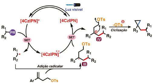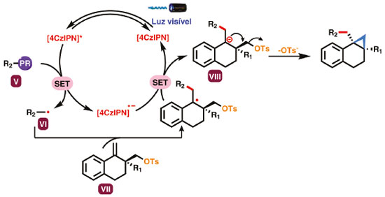 Nos estudos de otimização, complexos metálicos foram utilizados, resultando em rendimentos de 10,5 e 16% a mais do que os obtidos com o 4CzIPN. Apesar de ser um valor considerável, os autores relataram que o 4CzIPN provou ser o fotocatalisador ideal para a reação, considerando especialmente a alta conversão do produto, o baixo custo do catalisador e sua natureza livre de metal, além de não ter sido necessário nenhum aditivo para conduzir a reação. Nessa estratégia, o precursor de radical V oxida-se pela transferência de um elétron do fotocatalisador excitado, sofrendo, em seguida, uma fragmentação homolítica para formar o radical alquílico VI (Figura 9). Esse radical adiciona-se a VII, obtendo-se um radical α-aril que será reduzido para produzir o ânion em VIII. O ânion então ataca a ligação eletrofílica adjacente ao grupo tosilato, fechando o anel e expulsando o grupo tosilato.