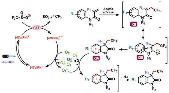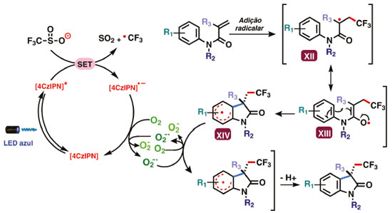 Aqui, o emprego do 4CzIPN como fotocatalisador também se mostrou mais vantajoso em relação aos fotocatalisadores metálicos. Os estudos relacionados à otimização da condição reacional mostraram que o rendimento isolado do produto quando se utiliza o 4CzIPN (83%) é maior em relação aos complexos Ir(ppy)2(dtbpy)PF6 (64%), [Ir[dF(CF3)ppy]2(dtbbpy)]PF6 (71%) e [Ru(bpy)3Cl2] (traços). Inicialmente, o mecanismo dessa reação se processa de forma idêntica à descrita na Figura 10, pela geração do radical CF3 a partir do composto 13. Esse radical se adiciona à N-acrilamida, o que resulta na formação do radical XII que, por ressonância, gera o intermediário XIII, sofrendo uma ciclização para dar origem ao radical XIV. Por sua vez, XIV é oxidado e após desprotonação origina o oxindol 16, como descrito na Figura 11.
