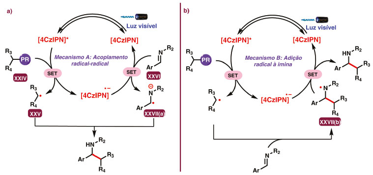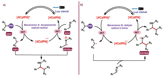 A escolha do DMSO como solvente foi feita com base em estudos que levaram em consideração o tempo de reação e o catalisador a ser utilizado. Feita essa otimização, os autores realizaram um estudo para definir qual o melhor catalisador a ser utilizado. Foram obtidas boas conversões ao se utilizar catalisadores de rutênio e irídio, sendo elas de 94% para o Ru(bpy)3(PF6)2, de 97% para o [Ir{dFCF3ppy}2(bpy)]PF6 e de 98% para o Ir(ppy)3. A escolha do 4CzIPN residiu, portanto, não só em sua maior eficiência, com conversão maior que 99%, mas também no seu menor custo e por ser uma alternativa mais sustentável quando comparado ao catalisadores metálicos. Para essa transformação, dois mecanismos reacionais foram propostos: a) a imina é reduzida por um processo de transferência de um elétron com o catalisador no seu estado reduzido, originando o ânion radical XXVII(a), cuja carga negativa está centrada no átomo de nitrogênio, que, por sua vez, realiza um acoplamento radical-radical com XXV, anteriormente gerado a partir do biscatecolato pela transferência de um elétron para o estado excitado do fotocatalisador, dando origem ao produto 25 (Figura 15a).