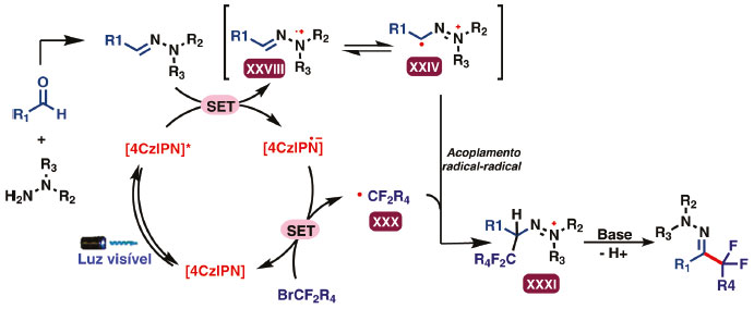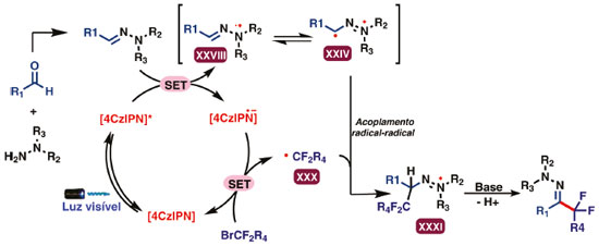 No sistema reportado, a hidrazona derivada do aldeído gerada in situ participa de um processo de TEU com o catalisador no seu estado excitado formando o intermediário radical XXVIII ou XXIV (Figura 17). O fotocatalisador reduzido é então capaz de participar novamente de um processo de SET com a espécie de bromodifluorado 28, dando origem ao radical CF2R XXX. Esse radical XXX se adiciona ao intermediário XXIV, originando o aminocátion XXXI que, ao passar por um processo de tautomerização, leva à formação do produto desejado 29.