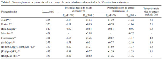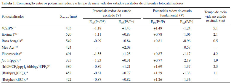 Recentemente, moléculas da classe dos carbazoil dicianobenzenos, em especial o 1,2,3,5-tetraquis(carbazol-9-il)-4,6-dicianobenzeno (4CzIPN), têm atraído bastante atenção de pesquisadores em virtude da sua potencial aplicação como fotocatalisador orgânico livre de metais. Dentre outros aspectos, essa atenção se deve a seus potenciais de oxirredução e de seu elevado tempo de meia-vida no estado excitado, que são equiparáveis aos dos catalisadores baseados em metais de transição, como é o caso do [Ru(bpy)3](PF6)2 e dos catalisadores de irídio mostrados na Tabela 1. Ainda, tanto os potenciais de redução quanto os de oxidação do 4CzIPN são comparáveis com os do [Ir[dF(CF3)ppy]2-(dtbbpy)](PF6). Os fotocatalisadores são fracos oxidantes/redutores de elétrons em seus estados fundamentais, porém, nos respectivos estados excitados, são potentes reagentes de transferência de elétrons.2 Uma comparação entre as características de diferentes fotocatalisadores está mostrada na Tabela 1.