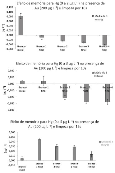 ![]() Figura 1. Avaliação do efeito memória do Hg em ICP-MS; branco inicial: concentração de Hg no branco da curva de calibração antes da análise das soluções de calibração; branco final: concentração de Hg no mesmo branco após a análise das soluções de calibração
