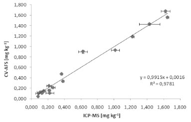 Visando comparar melhor os dados obtidos para as amostras in natura, esses também foram avaliados mediante correlação linear, conforme mostrado na Figura 2. O erro sistemático foi < 1% e a correlação boa, com R2 = 0,9781 (y = 0,9915x + 0,0016), confirmado os resultados obtidos mediante o teste t. Assim sendo, ICP-MS pode ser uma alternativa para determinação de Hg, possibilitando uma análise mais rápida que a CV-AFS.