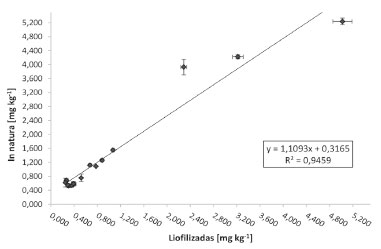 A Figura 3 exibe a correlação dos valores de concentração de Hg em amostras in natura e liofilizadas analisadas por CV-AFS, nas quais foram observados erros sistemáticos (cerca de 10%) para os dois conjuntos de dados (y = 1,1093x + 0,3165), conforme evidenciado pelo valor de inclinação da reta nesse conjunto, confirmando perda de Hg durante o processo de liofilização.