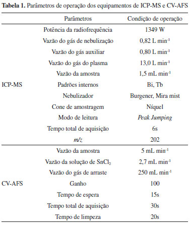 PARTE EXPERIMENTAL Equipamentos e acessórios As amostras foram analisadas por ICP-MS (modelo X series 2-Thermo Scientific) e por CV-AFS (modelo Millennium System-PS Analytical), ambos os equipamentos operados de acordo com as especificações constantes na Tabela 1. Os demais equipamentos e acessórios utilizados foram: balança analítica (AB204 - Mettler Toledo, EUA); pipetas automáticas (Gilson, França; Boeco, Alemanha); digestor de amostras por micro-ondas (Speedwave four SW4 - Berghof - Alemanha) e vidrarias de uso rotineiro em laboratório de análises químicas.