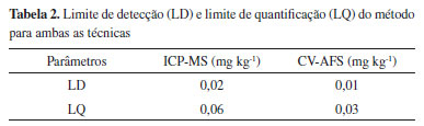A análise estatística para comparação entre as duas técnica analíticas mostra que os valores médios de LD e LQ não foram significativamente diferentes (tcalculado = 0,2952, ttabelado=2, n=2, t de Student pareado). Comparação dos resultados: ICP-MS e CV-AFS Os resultados das análises por CV-AFS e ICP-MS são apresentados na Tabela 3. Foi realizado o teste F para verificar se os resultados poderiam ser considerados comparáveis. O teste F indicou que os resultados não são significativamente diferentes entre si, os dois conjuntos de dados foram avaliados mediante o teste t de Student pareado, para o conjunto de dados obtidos para as amostras in natura. O valor de t calculado (0,1703) foi menor que o tabelado (2,09; n=20), indicando que não houve diferença significativa (com 95% de confiança) entre os resultados.