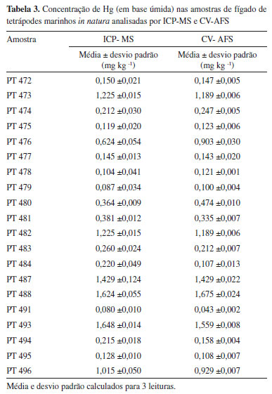 | Determinação de mercúrio em fígado de tetrápodes marinhos por espectrometria de fluorescência atômica acoplada a geração de vapor frio (CV-AFS) e espectrometria de massa com fonte de plasma indutivamente acoplado (ICP-MS): uma comparação sistemática entre as duas técnicas Determination of mercury in liver of marine tetrapods by cold vapor atomic fluorescence spectrometry and inductively coupled plasma mass spectrometry in biological samples: a systematic comparison between the two techniques |