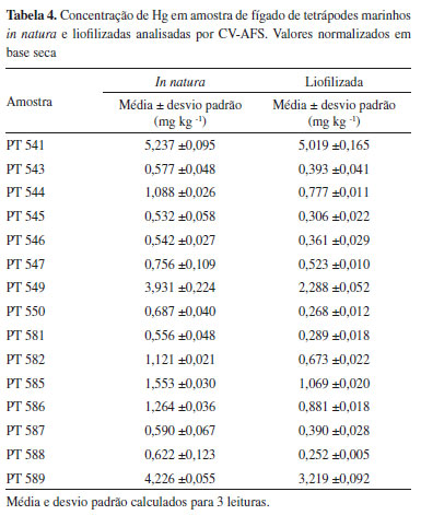 CONCLUSÕES As análises mostraram que a determinação de Hg em tecido hepático de tetrápodes marinhos é possível por ICP-MS desde que sejam seguidas as condições de contorno para minimizar o efeito memória do Hg (concentração de Hg até 3 µg L-1). Os limites de detecção obtidos foram semelhantes para métodos baseados em ICP-MS e CV-AFS. A avaliação da perda de Hg durante o processo de liofilização mostrou diferença significativa (nível de confiança de 95%), evidenciando perda de Hg, em média, de 10% no processo. Os métodos utilizados para determinação de Hg, tanto por CV-AFS quanto por ICP-MS, podem ser considerados semelhantes, sendo possível a aplicação de ambos em determinações rotineiras de Hg.