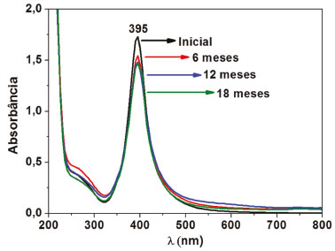 ![]() Figura 1. Espectros UV-vis do coloide de AgNPs pós-síntese (inicial) e após 6, 12 e 18 meses