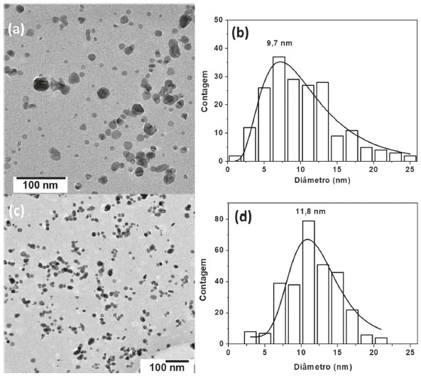 ![]() Figura 2. Imagens TEM e suas correspondentes distribuições de diâmetros de AgNPs após a síntese (a)-(b) e após 18 meses da síntese (c)-(d)