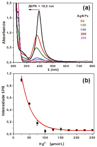Os resultados das medidas de UV-vis do primeiro teste de interação entre as AgNPs e o íon Hg2+ estão mostrados na Figura 3. Como pode ser observado, a adição das alíquotas da solução de Hg2+ 1,0 x 10-3 mol L-1 provocou uma diminuição de intensidade da banda SPR com extinção do sinal após adição total de 125 µL (Figura 3b). Além disso, também são registrados deslocamentos do máximo de absorção da banda plasmon para valores menores que 395 nm, resultando em uma variação máxima de 18,6 nm (Figura 3a). Considerando a diluição, a concentração final de Hg2+, após adição de 125 µL da solução 1,0 x 10-3 mol L-1, foi igual a 1,5 x 10-4 mol L-1. As alterações observadas na banda SPR indicam que as nanopartículas de prata foram oxidadas, levando a uma redução progressiva dos seus respectivos tamanhos até o completo desaparecimento do meio. O comportamento redox do sistema está de acordo com o previsto teoricamente. O potencial padrão de redução do mercúrio (Eo = 0,85 V) é maior do que o da prata (Eo = - 0,80 V), indicando que para esse sistema a prata sofrerá oxidação na presença de íons Hg2+, o qual será reduzido.34 Esse par redox irá produzir uma variação de potencial positivo (0,05 V), indicando espontaneidade do processo e reação global 2Ag0 + Hg2+ → 2Ag+ + Hg0. A diminuição de intensidade da banda SPR em função do aumento da concentração de Hg2+, aprensenta-se como um decaimento exponencial, sugerindo uma saturação do meio após a adição de 125 µL da solução de mercúrio, levando a um desaparecimento total do sinal após a adição de 200 µL (Figura 3b).