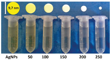 Outra forte evidência do processo redox foi a mudança de cor que ocorreu com o coloide de AgNPs em função da quantidade de Hg2+ adicionada (Figura 4). A mudança de cor do amarelo para o incolor indica redução do tamanho das nanopartículas que ocorreu devido a sua oxidação provocada pela presença de Hg2+, liberando íons Ag+ no meio. Dessa maneira, conclui-se que tanto as modificações da banda SPR (diminuição de intensidade e deslocamento para menores valores de comprimento de onda) quanto a mudança de cor do coloide AgNPs são indicadores da interação das nanopartículas de prata com os íons Hg2+. Esse resultado mostra que, apesar da alta estabilidade do coloide de AgNPs, a integridade das nanopartículas é afetada na presença do íon Hg2+. Nessa etapa, o docente também poderá gerar uma discussão com os alunos sobre o efeito colorimétrico no coloide, como resultado da oxidação e consequente diminuição do tamanho das AgNPs. Além disso, é importante considerar a contribuição do efeito de diluição do meio, à medida que as alíquotas da solução de Hg2+ são adicionadas.