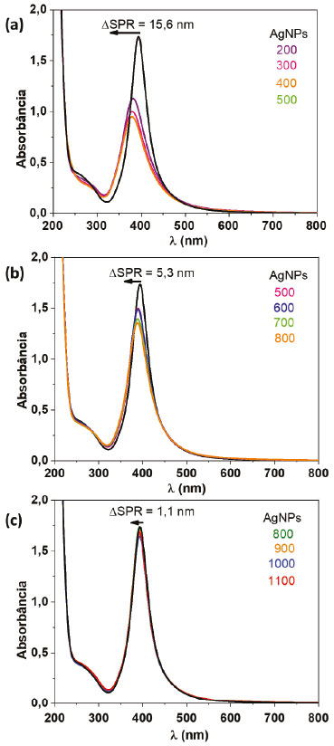 ![]() Figura 5. Espectros de absorção na região do UV-Vis do coloide de AgNPs e espectros do coloide após a adição de diferentes volumes (µL) de Hg2+ em diferentes concentrações (a) 10-4, (b) 10-5 e (c) 10-6 mol L-1