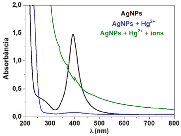![]() Figura 6. Espectros UV-vis de AgNPs, após adição de 250 µL de Hg2+ 1,0 x 10-3 mol L-1 e após a adição de mesmo volume da mistura dos íons Cu2+, Ni2+, Fe2+, Sn2+ e Zn2+, contendo Hg2+