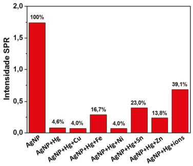 Para entender melhor o resultado da Figura 6, foram avaliadas a interferência conjunta e as interferências individuais dos íons testados sobre a interação entre as AgNPs e Hg2+, os resultados são apresentados na forma de gráfico de barras em valores de porcentagem na Figura 7. As porcentagens foram calculadas atribuindo 100% para a intensidade da banda SPR do colóide de AgNPs, usado como referência. Pode-se observar que os íons Cu2+ e Ni2+ praticamente não interferem na reação entre AgNPs e Hg2+, uma vez que a queda de intensidade da banda SPR é bem pronunciada e equivalente a intensidade da banda obtida na presença de ions Hg2+, resultando apenas em 4% em relação à intensidade da banda obtida para o coloide AgNPs. Esse resultado está de acordo com os potenciais padrão de redução dos íons cobre e níquel, que são menores do que os potenciais da prata, portanto, esses íons se mantêm oxidados no meio (Tabela 1).36
