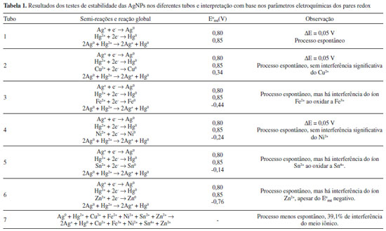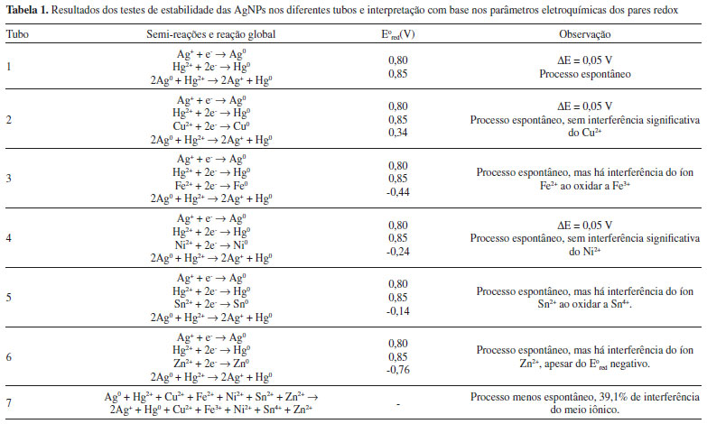 | Efeito do Hg2+ e dos íons Cu2+, Fe2+, Ni2+, Sn2+ E Zn2+ na estabilidade de nanopartículas de prata: uma prática interdisciplinar de nanotecnologia experimental Effect of Hg2+ and of the ions Cu2+, Fe2+, Ni2+, Sn2+, AND Zn2+ on the stability of silver nanoparticles: an interdisciplinary practice of experimental nanotechnology |