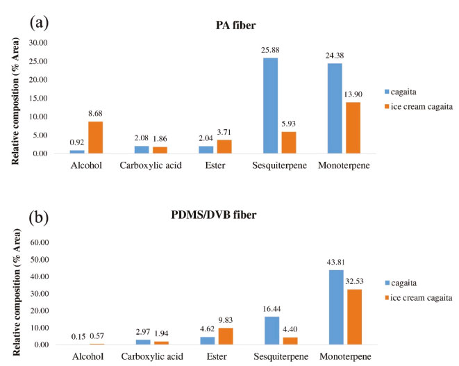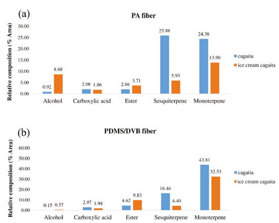 ![]() Figure 2. Comparison of effectiveness of SPME fibers. Relative area (%) of chemical classes of volatile compounds identified in cagaita and cagaita ice cream using (a) PA and (b) PDMS/DVB fibers by SPME/GC-MS
