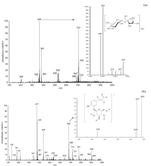 ![]() Figure 3. Representation of (a) sucrose (m/z 365) in PS(+)-MS and (b) caffeic acid hexoside dimer (m/z 683) in PS(-)-MS of cagaita ice cream sample