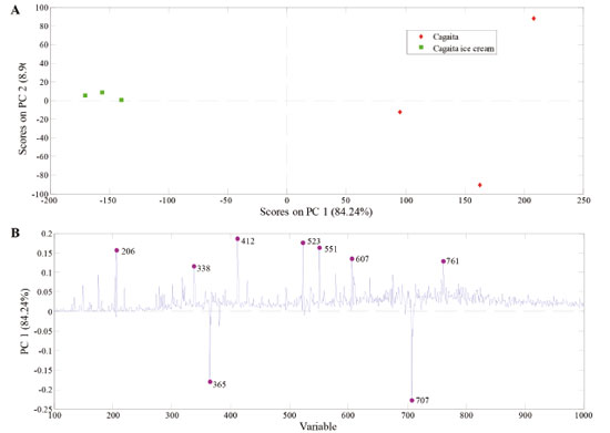 ![]() Figure 4. PCA model built with PS(+)-MS data from cagaita pulp and cagaita ice cream samples. The upper plot (scores) split the two sets of samples into well-distinguished groups. The bottom plot (loadings) shows the main ions that account for this separation