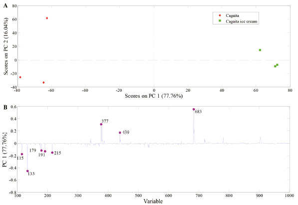 ![]() Figure 5. PCA model built with PS(-)-MS data from cagaita pulp and cagaita ice cream samples. The upper plot (scores) split the two sets of samples into well-distinguished groups. The bottom plot (loadings) shows the main ions that account for this separation