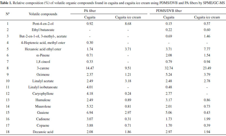 RESULTS AND DISCUSSION Volatile compounds profile Table 1 shows the volatile compounds identified in samples of cagaita pulp and cagaita ice cream. Eighteen volatile compounds were identified in cagaita, including 16 using PA fibers and 17 using PDMS/DVB fiber. Of these, 16 compounds were also found in cagaita ice cream (PA: n=12; PDMS/DVB: n=15). It's important to note that the abundance is based on the relative response of the MS scanned in the mass range from 35 to 300 and also due the selectivity of each fiber to the disctinct analytes. The 3-carene monoterpene was the most abundant in cagaita (PA = 14.47%, PDMS/DVB=32.74%) and cagaita ice cream (PA = 9.51%, PDMS/DVB = 23.49%). The higher percentage of 3-carene found using the PDMS/DVB is problably due to the semi-polar characteristic of this fiber, which promoted a higher adsorption of this monoterpene in relation to the PA polar fiber. The use of fiber PA promoted an increase of 8.68% in the extraction of the compound Pent-4-en-2-ol in ice cream. This may be relateld to some effect by the ice cream mixture that provided a higher fiber adsorption. This can occur since the extraction of VOCs by HS-SPME is a physical-chemical equilibrium process, which depends, among other factors, on the type of fiber.2 Table 1 shows that most of the compounds identified in cagaita were also found in cagaita ice cream, thus the manufacturing process did not cause large losses of these volatile organic compounds in the product. The relative area of volatile compounds in ice cream generally decreased compared to cagaita pulp, which was expected because the manufacturing processing involves several steps such as homogenization of ingredients in a blender, agitation, and freezing. No articles were found in the literature that determined volatile compounds in fruit ice cream or evaluated the effect of processing on these volatile organic compounds. The relative area of the chemical classes of volatile compounds found in the samples evaluated as a function of the fibers used are in Figure 2.