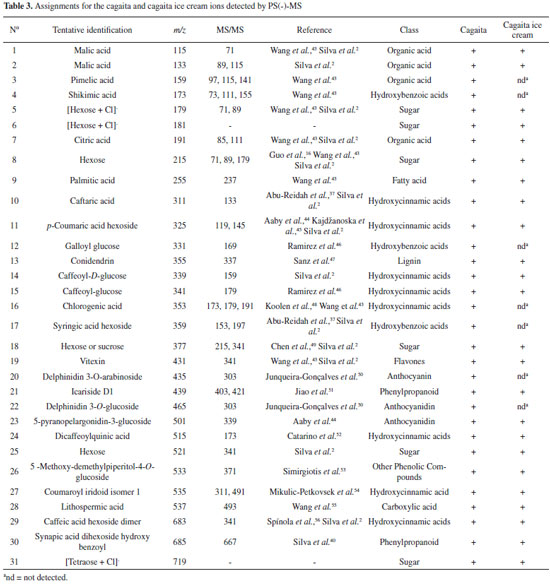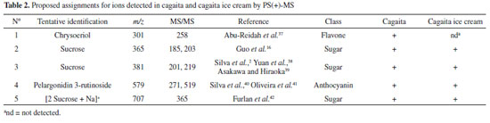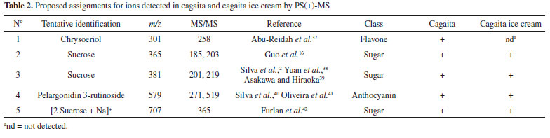 The PS(+)-MS identified 5 compounds of the flavone, anthocyanins, and sugars classes as in the form of sodium and potassium adducts (Table 2), which were also reported by Silva et al.2 when employing PS-MS in cagaita collected in the city of Sete Lagoas, MG, Brazil.
