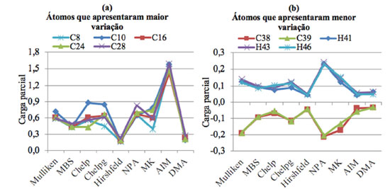 Inicialmente, foram examinados os cinco átomos da molécula que apresentaram as maiores variações de valores de carga parcial entre os métodos (Figura 3a) e os cinco átomos que apresentaram as menores variações desses valores (Figura 3b).