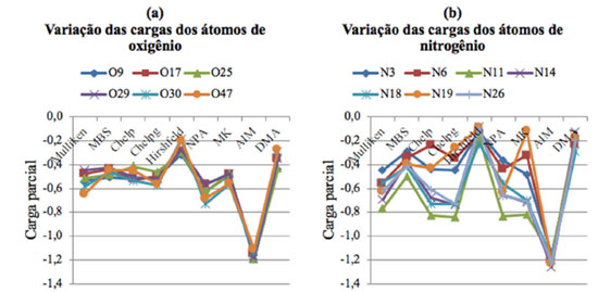 ![]() Figura 4. Cargas atômicas calculadas pelos nove diferentes métodos em unidades de e. (a) Variação das cargas dos átomos de oxigênio da molécula; (b) Variação das cargas dos átomos de nitrogênio da molécula