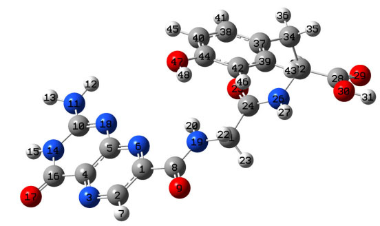![]() Figura 2. Geometria otimizada do NNPT. Átomos de carbono, hidrogênio, nitrogênio e oxigênio estão representados, respectivamente, pelas cores cinza, branco, azul e vermelho