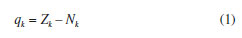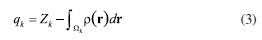 em que ρ é a densidade eletrônica e n é o vetor unitário normal à superfície. A Equação 2 é verdadeira se o gradiente da densidade eletrônica for paralelo à superfície (e assim seria ortogonal ao vetor n) ou se esse gradiente for nulo, que é o caso dos pontos críticos. Assim, a carga AIM de um átomo (qk) é definida como a diferença entre a carga nuclear (Zk) e o número de elétrons contidos no volume delimitado por superfícies de fluxo zero (definida na integral sobre o volume Ωk cercado pela superfície de fluxo zero do átomo k), conforme Equação 3,