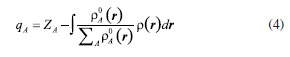 em que ZA é o número atômico do átomo A Embora esse método seja um avanço em relação aos métodos de Mulliken e aos derivados do potencial eletrostático por considerar a eletronegatividade dos átomos por meio do fator de ponderação, O método NPA13 se baseia na expansão de um conjunto de orbitais atômicos naturais (NAOs) para uma dada molécula em um conjunto de base de orbitais atômicos arbitrário. O método NPA então representa as ocupações (elementos diagonais da matriz densidade de uma partícula) desses NAOs para o sistema de interesse. Como os NAOs formam um conjunto ortonormal, abrangendo completamente o espaço da base de orbitais (geralmente não ortogonais), as populações naturais são inerentemente positivas e a soma fornece corretamente o número de elétrons. Como os NAOs são intrínsecos à função de onda e não a uma escolha particular de bases de orbitais, o método NPA é menos sensível a variações do tamanho conjunto de base. Assim, esse método evita falhas características do método de Mulliken ao mesmo tempo em que retém vantagens deste último, como o baixo custo computacional.22 Por fim, o método DMA14 descreve a distribuição de cargas em termos de uma expansão de momentos de multipolos elétricos centrados em dados pontos da molécula. Esses pontos em geral são os átomos da molécula, embora isso não seja obrigatório. A densidade de carga é então dividida em uma soma de produtos de funções de base gaussianas centradas nos átomos, cujos coeficientes são determinados a partir da matriz de densidade de um elétron. Os termos de expansão do método DMA possuem uma interpretação química intuitiva: os termos de monopolo correspondem às cargas atômicas; os dipolos fornecem informação sobre separação de cargas, ou seja, de polaridade e os momentos de quadrupolo são os primeiros momentos eletrostáticos a incluírem contribuições de "densidade fora do plano", sendo portanto usualmente associados à deslocalização de elétrons ou a pares isolados.45 O método DMA tende a ser mais acurado que outros métodos de cálculo de cargas parciais principalmente para cálculos de energia de interação intermolecular, já que esse método não particiona a carga elétrica molecular apenas em cargas atômicas, mas também, nesse caso, em momentos de dipolo e quadrupolo elétricos. Outro aspecto que torna o método DMA vantajoso é o fato de ele ser independente da função de base utilizada.37 Diversas aplicações da partição da densidade molecular de carga em multipolos elétricos DMA foram feitas pelo grupo de um dos autores (I.B.J.), incluindo estudos de sensibilidade de explosivos,46-48 otimização do tamanho de clusters49 e catálise.50,51