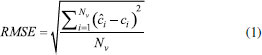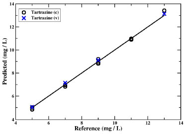 ![]() Figure 2. Comparison between the concentrations of tartrazine predicted by CLS for the calibration (c) and validation (v) samples with the corresponding reference values. The exact agreement is represented by the solid line