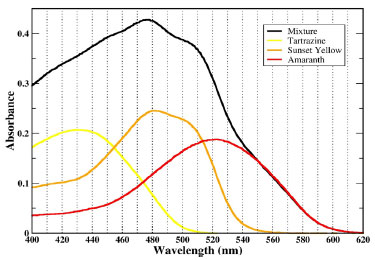 ![]() Figure 1. Measured visible absorption spectra of tartrazine (5.00 mg L-1), sunset yellow (5.00 mg L-1) and amaranth (5.00 mg L-1) in 0.1 mol L-1 of HCl. The mixture spectrum contains the same concentration of each dye