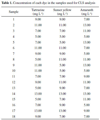 EXPERIMENTAL The experiment is primarily aimed at upper-level undergraduate students of chemistry courses; however, it is also amenable to other courses where students have some knowledge of linear algebra and analytical chemistry. We suggest two lab sessions of 3-4 hours to perform the experiment. Students may be split into small groups of 2-3 members. During the first session, each group prepares solutions of the standard curves and records their spectra. Solutions corresponding to the calibration and validation sets are also prepared in that lab session. Additionally, the instructor may provide unknown samples to be analyzed by the groups. The first lab session ends after the spectra of all solutions have been recorded. The second lab session is focused on data analysis. Students may act in groups or individually, depending on the availability of working terminals at the computer lab. Class starts with a brief introduction to the language syntax of the software chosen for the algebraic computations. Subsequently, students determine the concentration of tartrazine, sunset yellow and amaranth in the validation samples (and optionally, for the unknown ones) through the SE and CLS methods. The numerical computations are carried out using the GNU Octave software,22 following the instructions provided in the Supporting Information. Samples and data collection From stock solutions of 500 mg L-1, in 0.1 mol L-1 HCl, containing a single dye (tartrazine, sunset yellow or amaranth), groups are required to prepare univariate analytical curves with final concentrations ranging from 5 to 25 mg L-1. The univariate analytical curves should contain at least 5 different concentrations. Eighteen solutions containing tartrazine, sunset yellow and amaranth were also prepared by dilution of the single stock solutions (see Table 1). From that table one notice that the concentration of each constituent within a sample can have one of the following values (mg L-1): 5.00, 7.00, 9.00, 11.00 or 13.00. The corresponding concentration was randomly selected using the "randperm" Octave's built-in function. That function creates "random" permutations based on the Mersenne-Twister pseudo-random number generator. In order to minimize concentration correlation within the set of samples, the concentrations may also be chosen using an experimental design, keeping a common sense that the calibration mixtures should be representative, as much as possible, of the combination of concentrations to be found in the future unknown samples.13